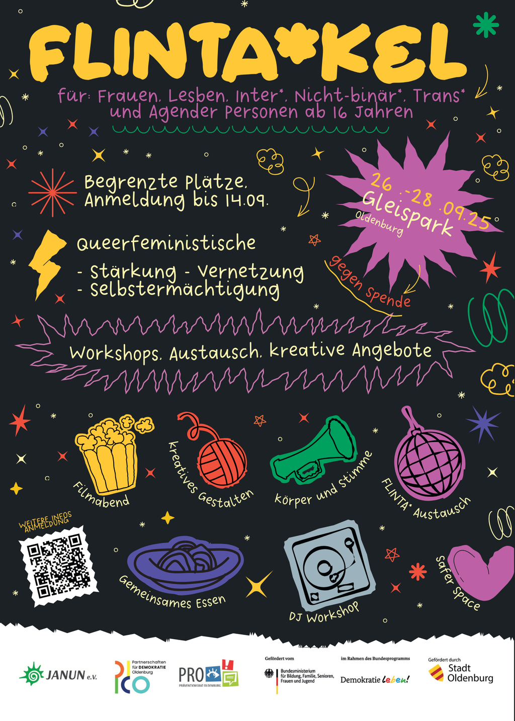 Im September 2025 organisieren wir, die Gruppe FLINTA*Hood, ein Empowerment Wochenende für FLINTA*s im Gleispark in Oldenburg. Wir wollen einen Safer Space für FLINTA*s und einen Raum für Austausch und nachhaltige Vernetzung schaffen.